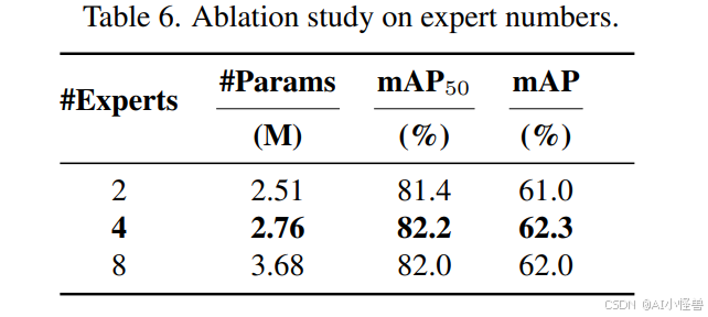 表 6 研究了专家数量对性能-效率权衡的影响。四个专家 在 62.3% mAP 和 82.2% mAP50,参数为 276 万时达到最佳平衡。仅使用 两个专家 导致 mAP 下降 1.3%(61.0%),表明其建模不同尺度和语义类别下多样化目标模式的能力不足。扩展到 八个专家 未能带来改进(62.0% mAP,-0.3%),同时参数增加了 33%(368 万),这表明存在过参数化问题,冗余的专家带来的收益递减。这验证了适度的专家多样性足以捕捉目标检测中的多尺度变化,我们采用 4个专家 作为默认配置。