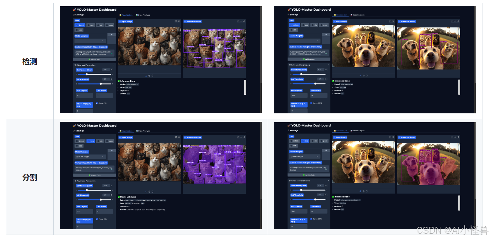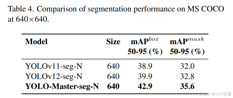 分割。在表 4 中,YOLO-Master-seg-N 实现了 35.6% 的掩膜 mAP,超过了 YOLOv12-seg-N 2.8%,展示了在定位和掩膜预测方面的同步改进。