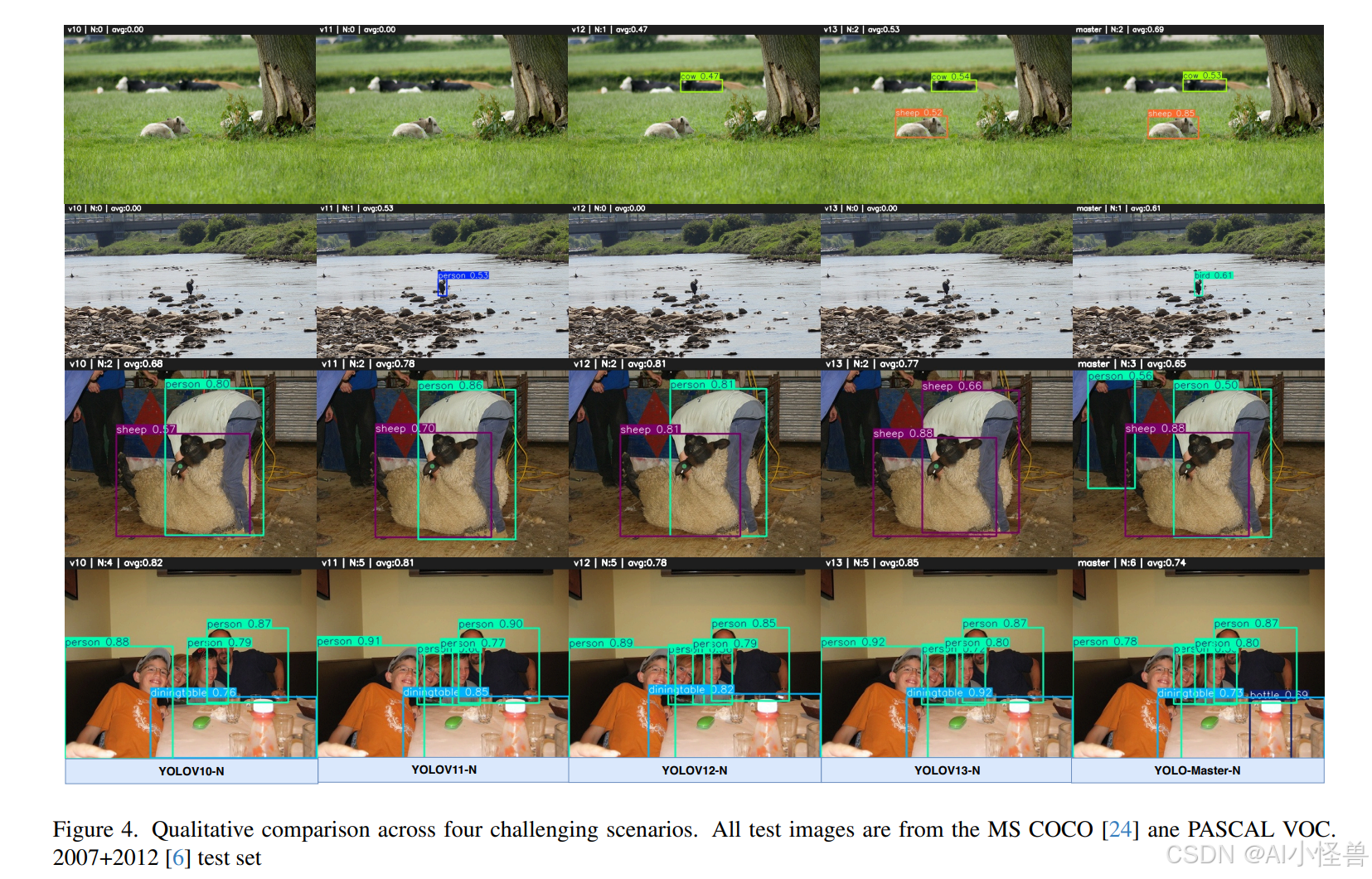 复杂场景(第 3 行)。在具有重叠动物和人类交互的剪羊毛挑战性场景中,YOLO-Master-N 实现了清晰的检测和准确定位(平均置信度 0.85 对 v13 的 0.77),展示了对复杂场景的有效处理。