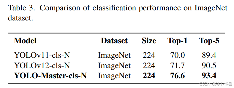 分类。如表 3 所示,YOLO-Master-cls-N 在 ImageNet 上达到了 76.6% 的 Top-1 准确率,相比 YOLOv11 和 YOLOv12 分别带来了 6.6% 和 4.9% 的显著提升。这突显了我们骨干网络强大的特征表示能力。