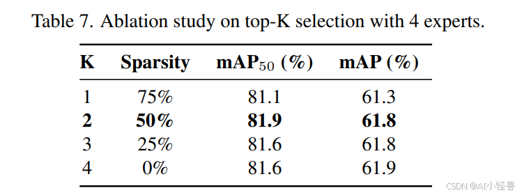 在给定 4 个专家的条件下,我们在表 7 中分析了 top-K 路由的效果。Top-2 路由 在 50% 稀疏度下取得了最佳性能(61.8% mAP)。Top-1 路由 遭受了 -0.5% 的 mAP 下降(61.3%),表明表征能力不足。激活 3个或4个 专家则未能带来进一步的收益。K=2 的甜点验证了我们的设计:两个互补的专家提供了足够的特征多样性,同时保持了计算效率。这一发现与最近的 MoE 文献 [7, 33] 一致,表明在视觉任务中,超过 K=2 的收益会递减。