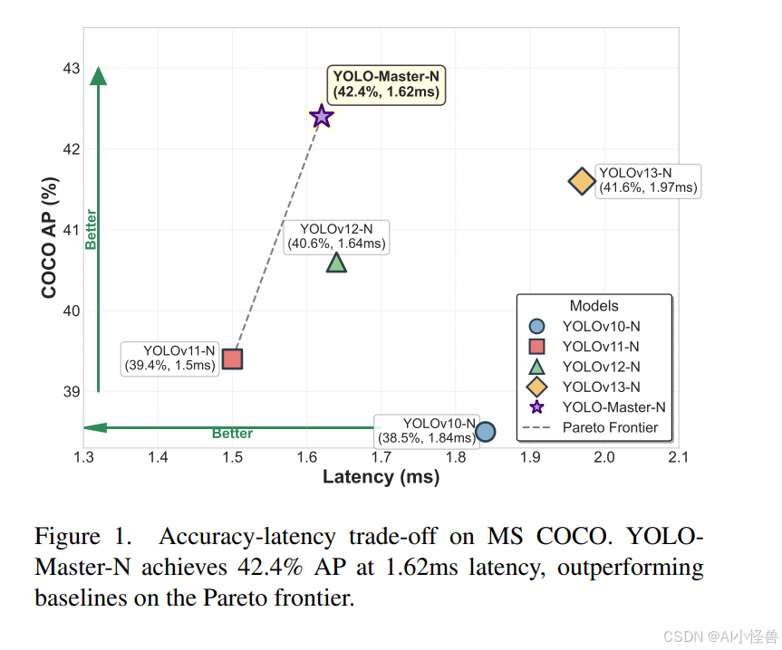 在五个大规模基准测试上的综合实验证明了 YOLO-Master 的优越性。在 MS COCO 上,我们的模型实现了 42.4% 的 AP 和 1.62ms 的延迟,比 YOLOv13-N 高出 +0.8% mAP,推理速度快 17.8%。值得注意的是,在具有挑战性的密集场景中收益最为明显,同时模型在典型输入上保持了效率并维持了实时推理速度。代码: isLinXu/YOLO-Master
