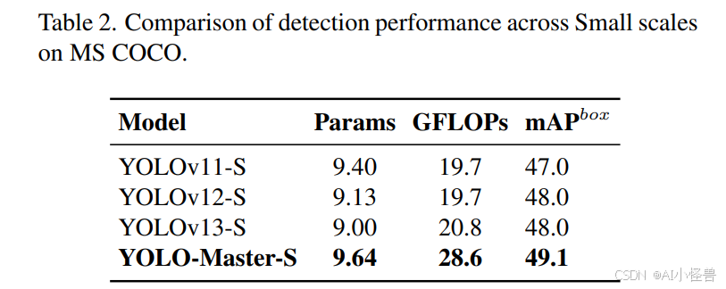 检测总结。作为补充,我们的检测变体(表 2)实现了 49.1% 的边界框 mAP,为小规模模型设立了新的最先进水平。这些一致的跨任务改进证实了 YOLO-Master 作为一个强大且通用的架构,能够有效提升多样化视觉识别范式的性能。