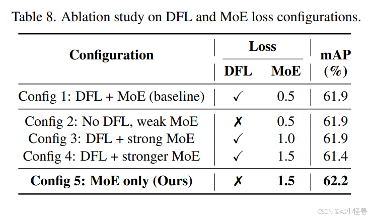 表 8 和图 3 分析了五种损失配置。出乎意料的是,完全移除 DFL 损失并仅使用 MoE 损失(权重=1.5)获得了 62.2% mAP 的最佳性能(比基线提升 +0.3%)。训练动态(图 3)解释了这一点:配置 4(DFL + 强 MoE λ=1.5)表现出严重的振荡,而配置 5(仅 MoE 损失)则平滑收敛。我们假设 DFL 损失和 MoE 损失会产生冲突的梯度。具体来说,DFL 强制执行基于均匀分布的精炼,而 MoE 损失鼓励实例自适应的专家专门化。当两者都具有显著权重时,它们会争夺梯度主导权,导致训练不稳定(配置 4:61.4% mAP,最差)。移除 DFL 消除了这一冲突,允许 MoE 损失同时指导回归和专家专门化。这表明,在混合专家架构中,MoE 损失有效地涵盖了 DFL 的角色。我们采用配置 5(仅 MoE 损失,λ = 1.5)作为默认配置。