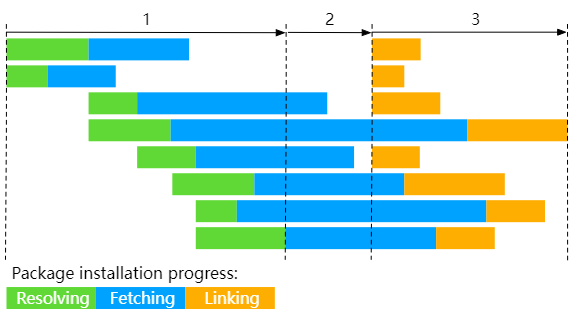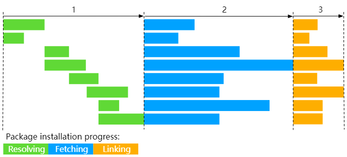 这种方法比传统的三阶段安装过程(解析、获取和将所有依赖项写入 node_modules)快得多。下面是传统的安装: