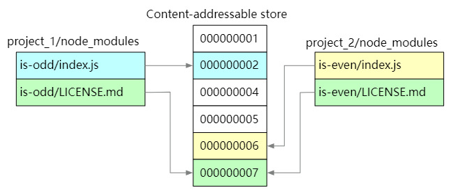 当软件包被被安装时,包里的文件会硬链接到这一位置,而不会占用额外的磁盘空间。 这允许你跨项目地共享同一版本的依赖。