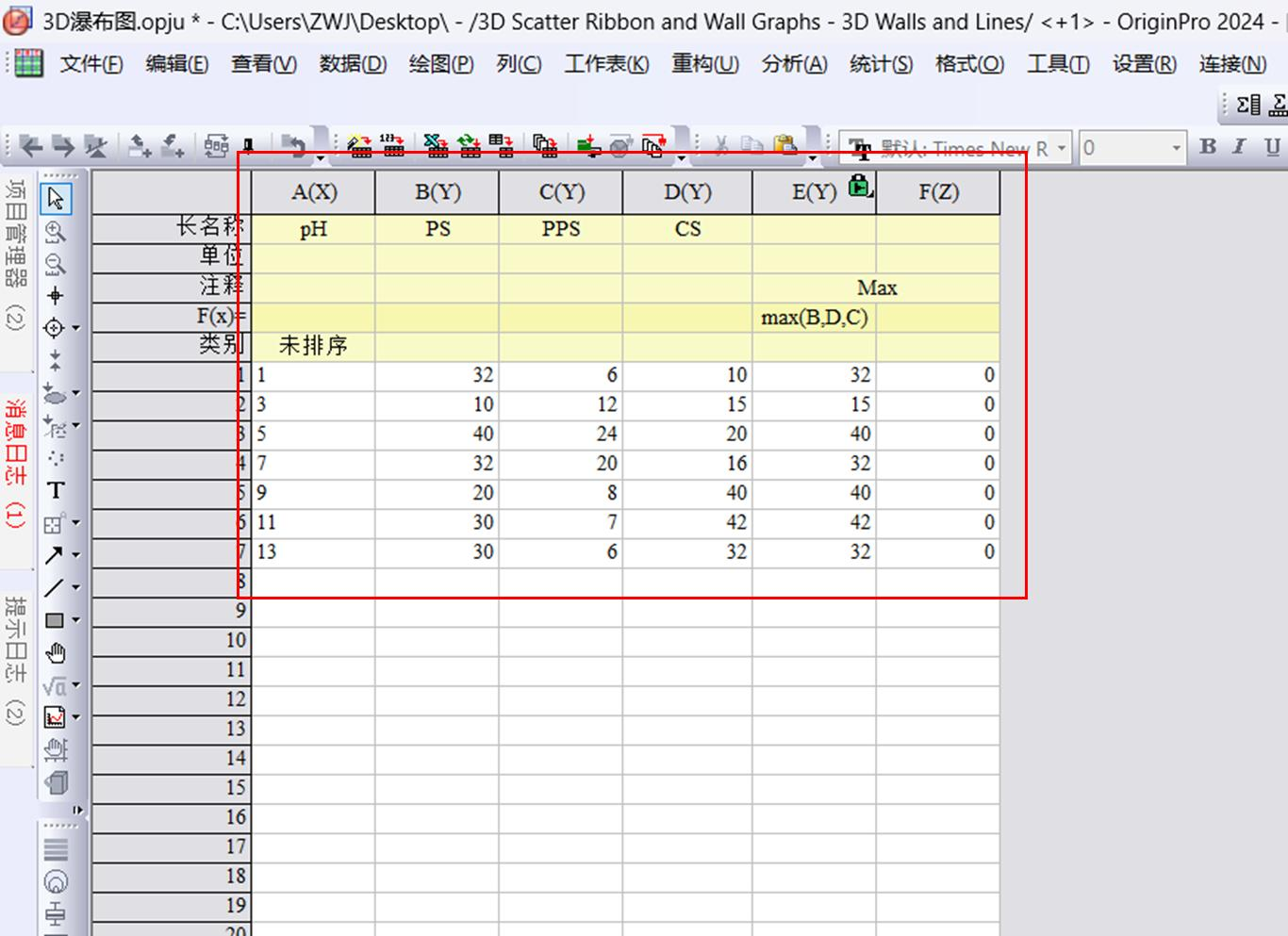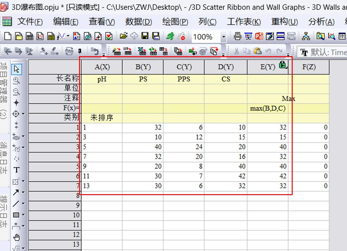 1.导入数据,数据格式为XYYYZ,倒数Y为点线图数据,因为是在XY平面上绘制的图形,所以Z数据均为0;