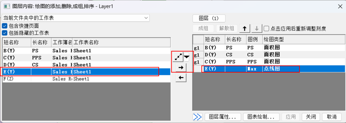 5.双击左上角的图层1,将点线图数据移动至右侧,点击应用;