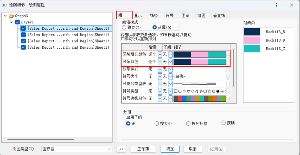 7.双击图形,对面积图、点线图进行修改,其中包括区域填充颜色、边框颜色等;