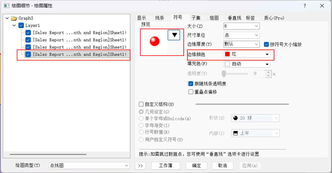 8.双击点线图,在跳出的对话框,取消原始数据,勾选XY投影,将符号大小和颜色修改成自己喜欢的颜色;