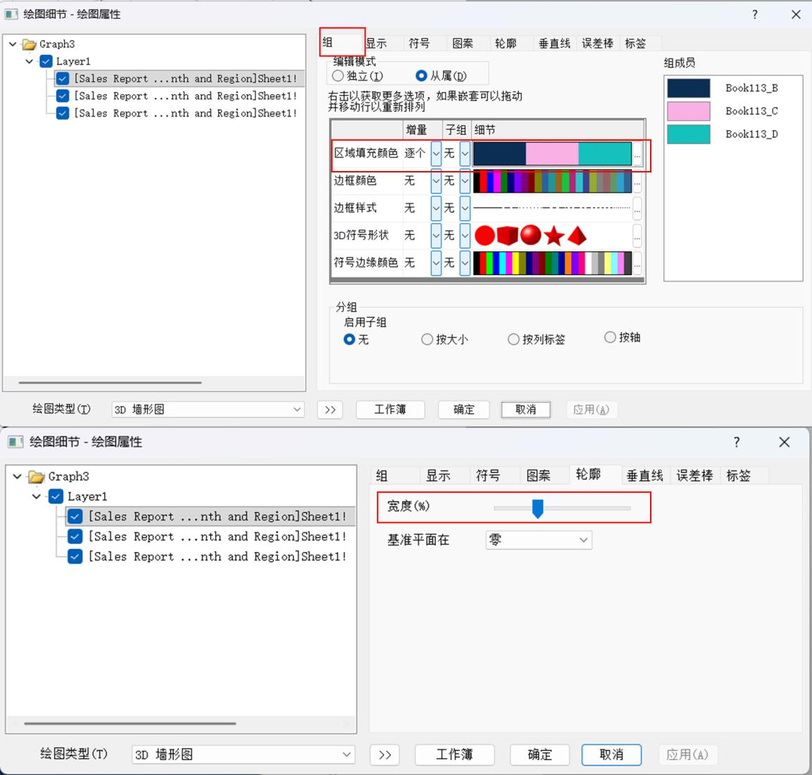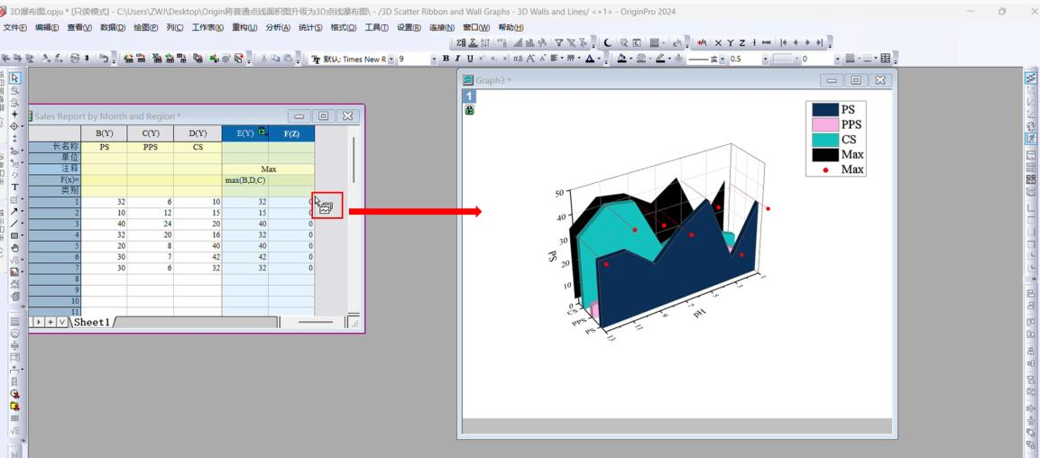 2.选中面积图数据,点击绘图---3D---3D墙形图;