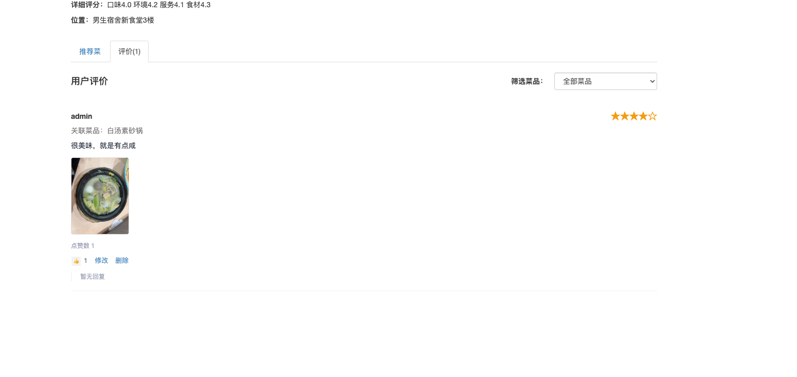 评价系统模块允许用户对菜品和店铺进行评价,包括评分、文字评价、图片上传、回复、点赞等功能。主要包括: