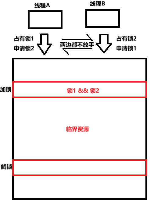 比如两个线程,线程A 线程B都想要访问某临界资源,但该临界资源需要具备两种锁才能访问,线程申请锁的操作是原子的,但申请一把锁是原子的,但是申请两把锁就不一定了。而线程A与线程B各占有一把锁,在不放手自己资源的同时又索要对方的锁,这就造成了死锁。
