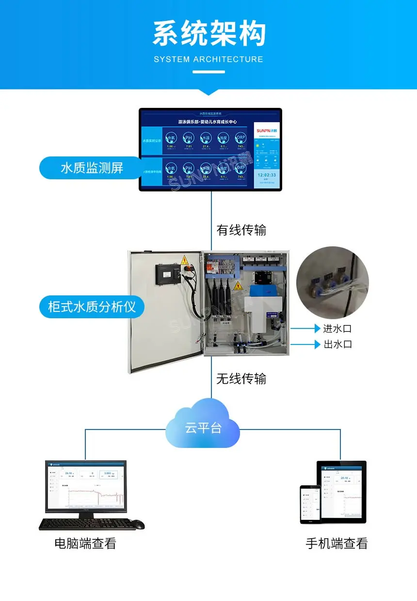 如此强大的前端显示,离不开一套稳定可靠的后台系统支撑。完整的系统架构通常包含几个核心部分:前端的水质监测屏负责展示;与之通过有线连接的柜式水质分析仪是核心"大脑",负责水样分析和数据处理;数据通过无线传输至云平台进行存储与深度分析;最终,管理者可以通过电脑端或手机端的应用,随时随地远程查看详细数据图表和历史趋势,实现全域、全天候的智能化管理。