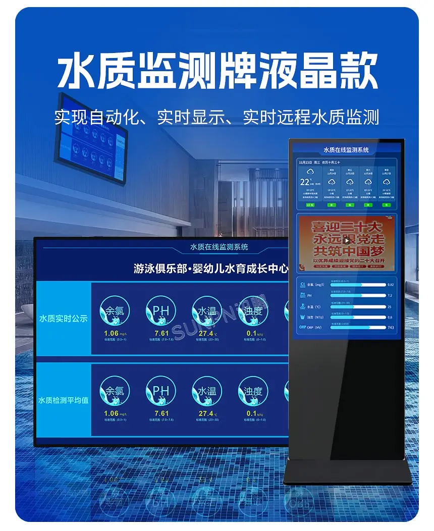 现代智能公示屏的功能远不止于显示几项基础数据。它支持高度定制化,可以根据不同场馆的需求,定制数据展示方式和界面布局,实现可视化显示。屏幕上不仅可以集成更多监测指标,如浊度、ORP、尿素含量、馆内温度等,甚至可以联动显示在馆人数,实现综合环境管理。