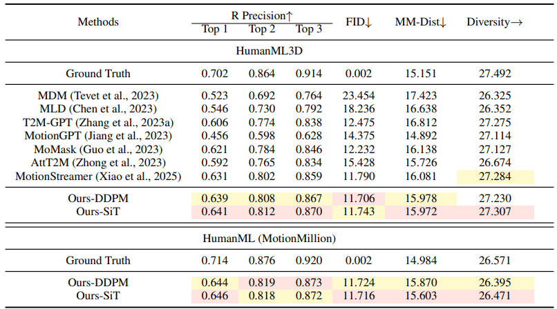 - 动作生成框架:采用了混合Transformer-扩散模型的连续自回归架构,并采用LaMP作为文本编码器。该设计将长时序连贯性与随机稳定性相统一,从而生成富有表现力的运动潜在表征,并实现语言与运动间的精准对齐;
