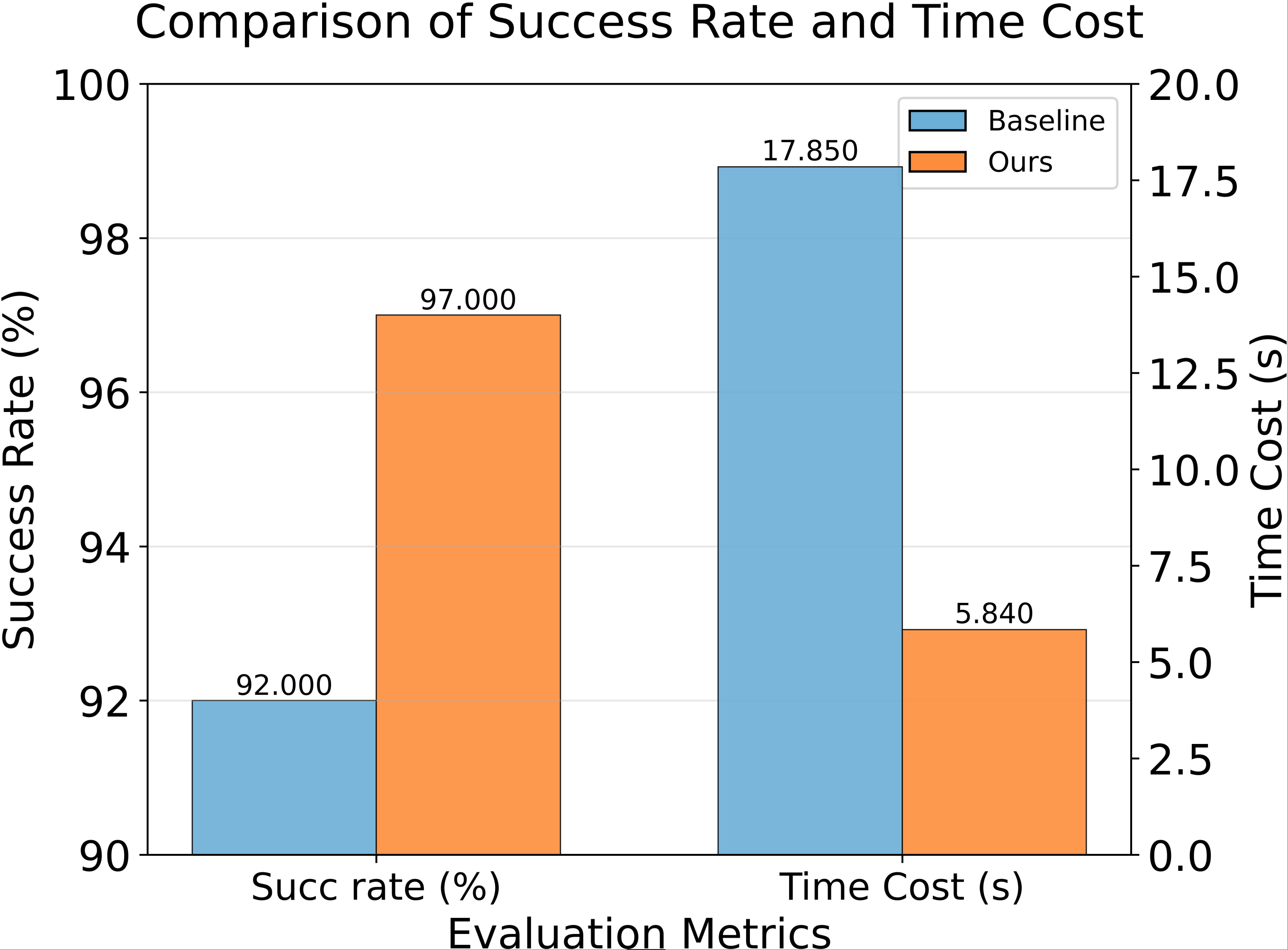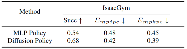 团队在动作生成质量、成功率、部署时间、追踪误差等方面上进行了全面实验,结果如图(其中Baseline表示以多层感知机为架构的显式驱动策略):