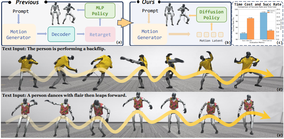- 基于扩散模型的策略框架:提出了基于扩散模型的人形机器人策略,该策略以运动潜在表征为条件,能够直接从噪声中解算出可执行动作,并通过DDIM加速采样技术实现流畅多样、物理合理的运动表现;