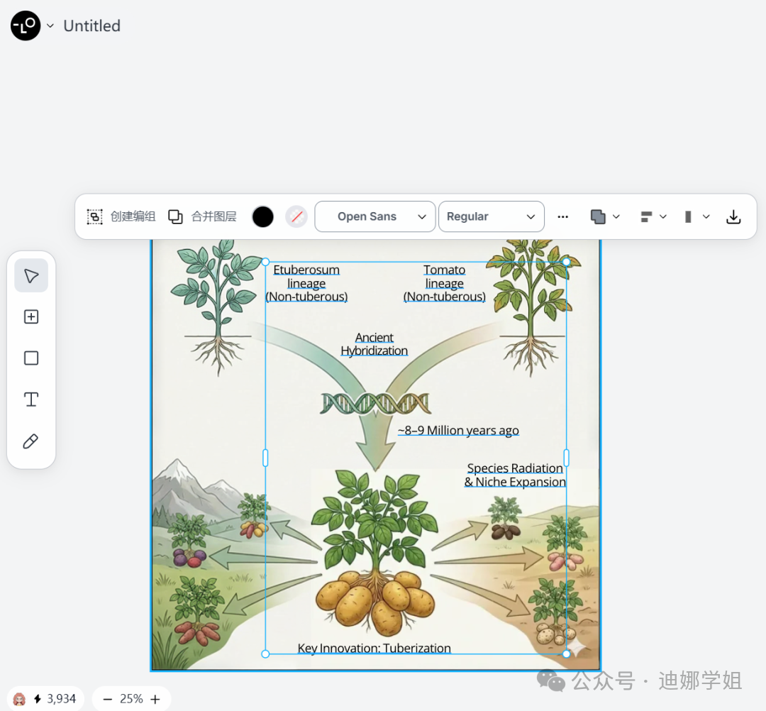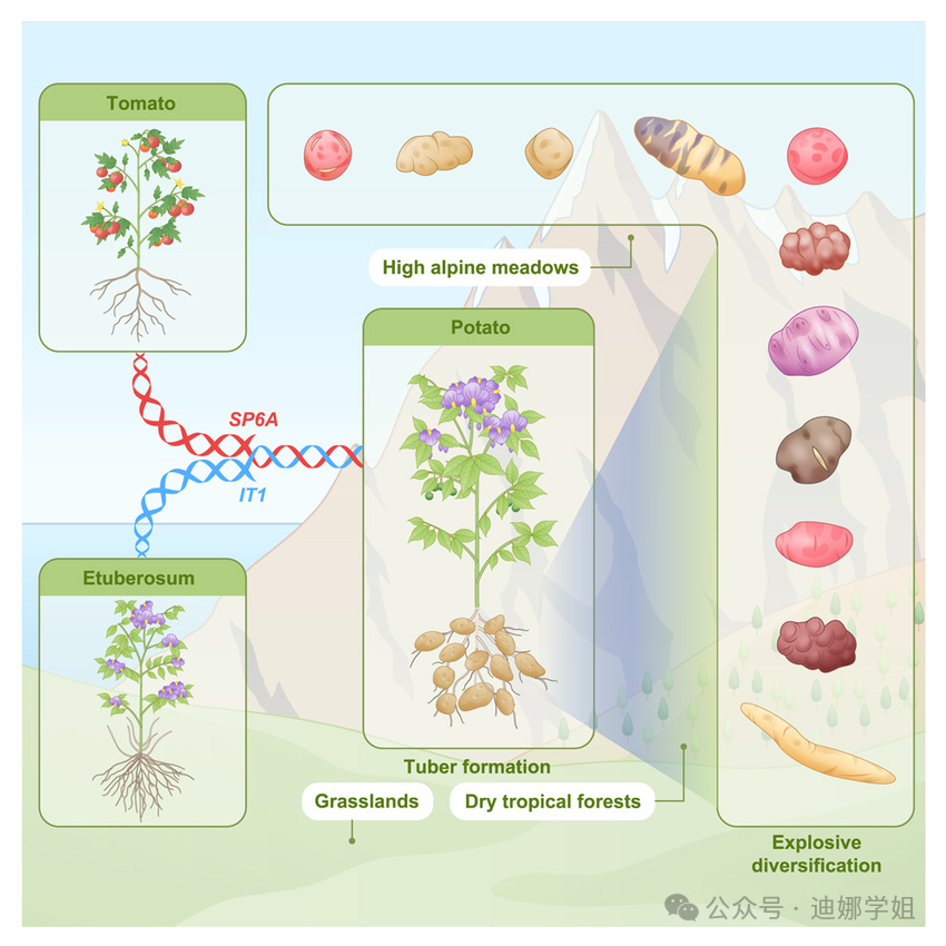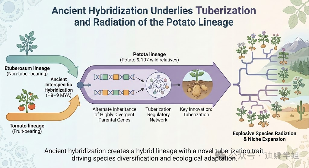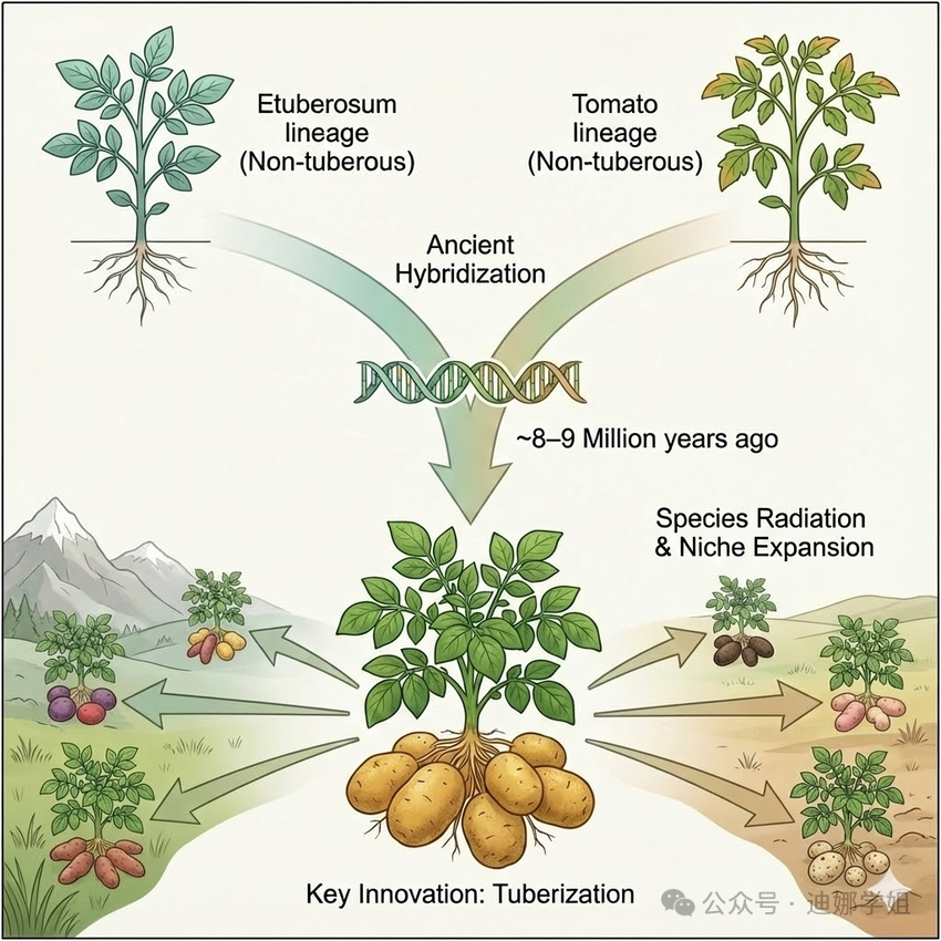 文章核心发现:马铃薯支系(Petota)起源于约800-900万年前 Etuberosum 和 Tomato 支系的远古同倍体杂交。这次杂交带来了双亲基因的组合,直接导致了地下薯块(tuber)的形成,并进而推动了该支系适应多种生态位,引发物种爆发性辐射演化。
