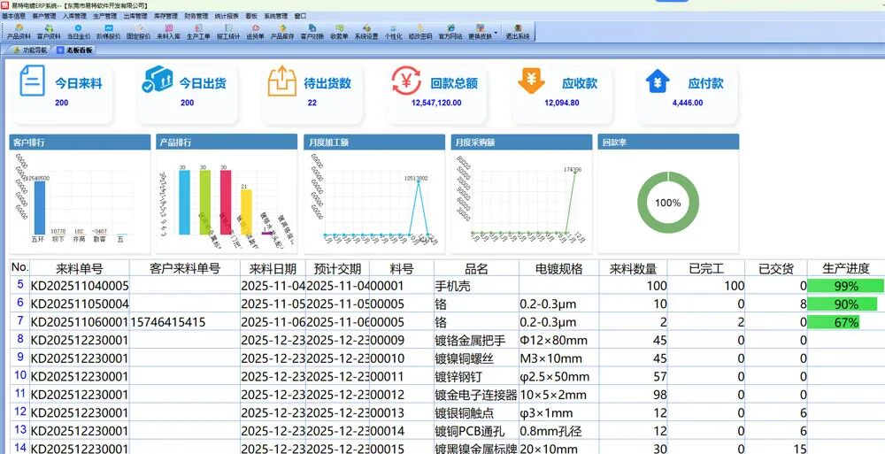 电镀加工厂是经典的来料加工型工厂,顾名思义就是接收客户的材料产品,经过一系列的处理加工之后,再送回到客户那边。通常客户送过来的原材料产品,其价值比较昂贵,但是传统的管理模式无法记录准确的库存情况,经常给工厂内部造成不少的损失。但电镀加工厂又不同于普通的制造工厂,管理模式也有所差异,市面上常见的库存管理软件并不能很好的解决电镀厂的痛点难题,针对电镀型工厂的管理,这里更推荐使用易特电镀ERP系统。