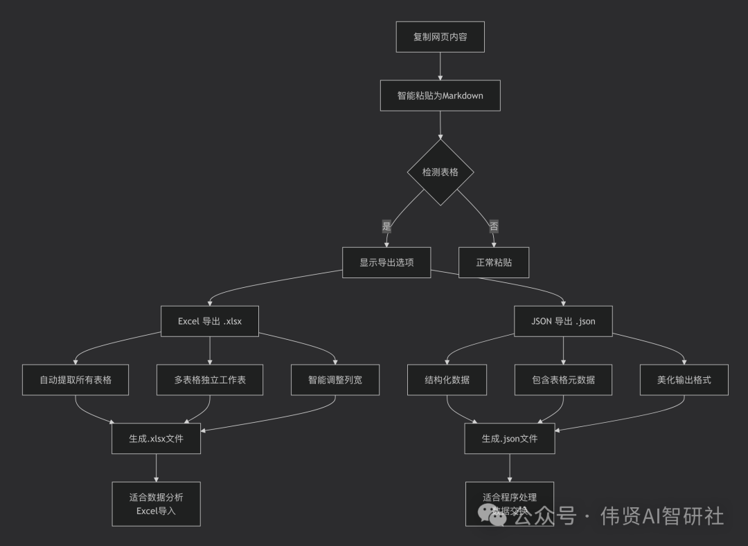 Markdown 转 Word (https://wxaiway.com/md2wd/),当识别到markdown中有表格时,增加了可以单独把表格导出成excel,方便进行数据处理。