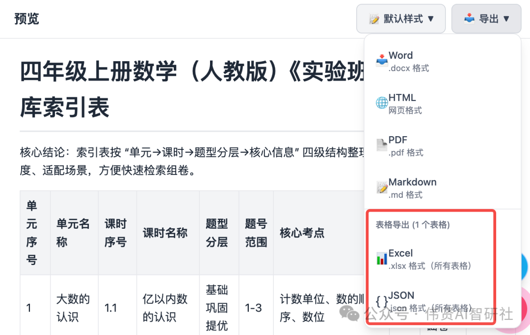 当 Markdown 内容包含表格时,会自动显示表格导出功能: