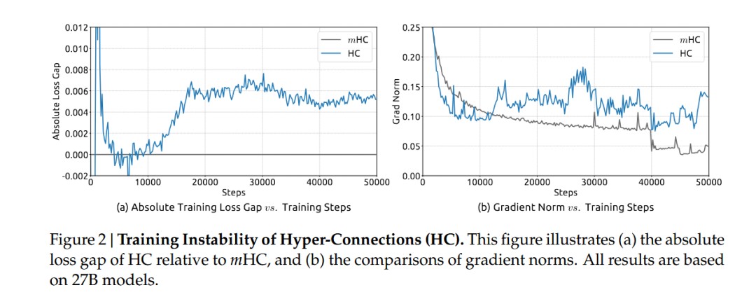 但 DeepSeek 团队之前(大概是去年 9 月那会儿)提了个 Hyper-Connections (好像看的人不多,我当时没太注意这个) 的概念,觉得简单的相加太浪费了就搞了个更复杂的连接方式来扩宽层间的信息通路。但是一旦你动了那个"相加",Identity 的属性就没了,梯度传播就开始不稳定,这样训练起来特别容易炸他们管这叫 Seesaw Effect(跷跷板效应)。