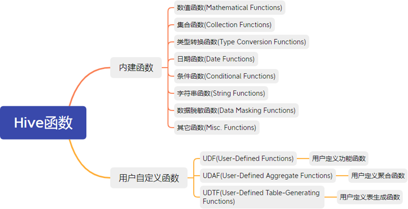 lHive的函数分为两大类:内置函数(Built-in Functions)、用户定义函数****UDF(User-Defined Functions):
