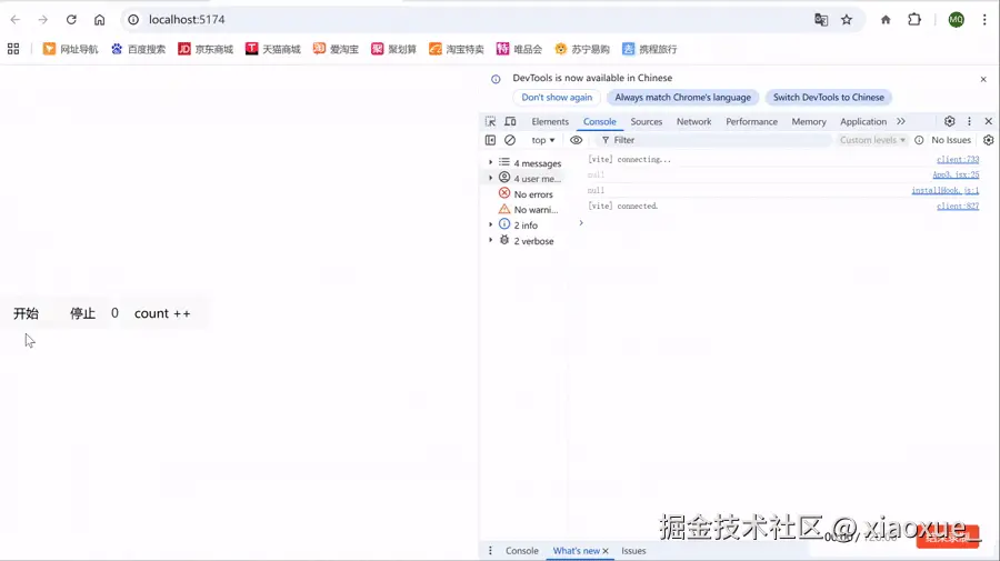 注意观察:点击开始按钮,系统自动分配一个ID值,点击停止,可以停止因为此时ID值未被修改;再次点击开始按钮,点击count++,然后再点击停止,此时无法停止,因为ID因count值修改触发useState响应式状态修改导致重新渲染而被重置了。