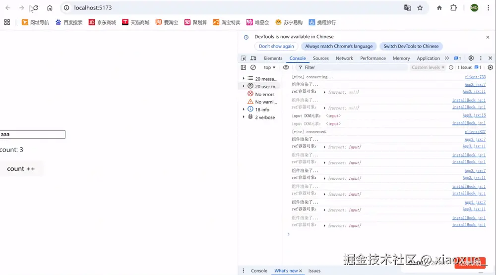 注意观察,光标自动聚焦于输入框、组件渲染了而inputRef容器对象始终不变、修改inputRef.current的值不会触发重新渲染: