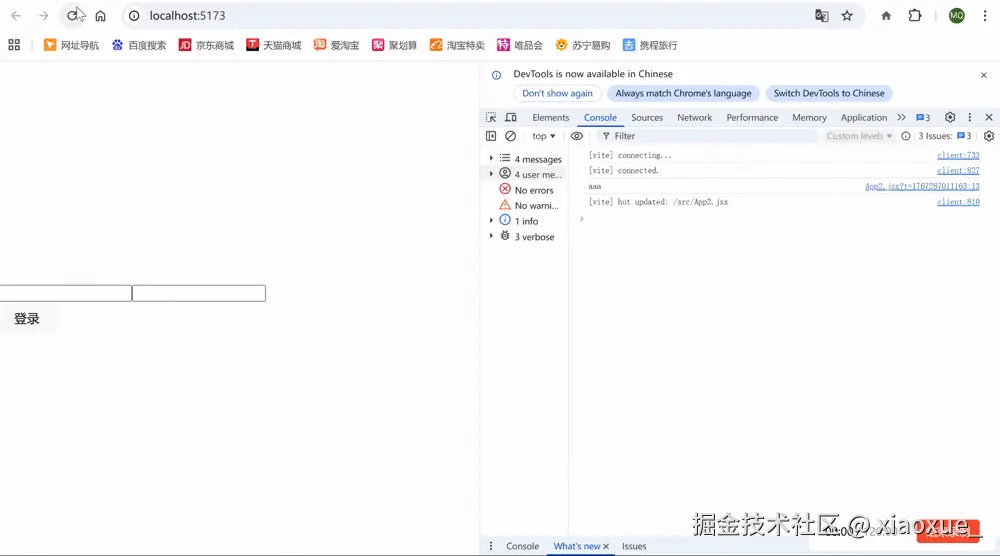 其中第一个输入框是受控组件,它通过 useState 定义响应式状态 value,以 value={value} 实现 React 状态对输入框显示值的单向绑定,又通过 onChange 事件监听输入变化,实时调用 setValue(e.target.value) 将 DOM 输入值同步到 React 状态中,输入框的所有状态完全由 React 管控,还能通过页面上渲染 {value} 实时预览输入内容。