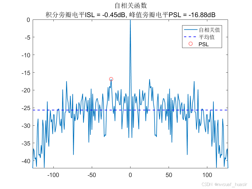 title(sprintf('自相关函数\n积分旁瓣电平ISL = %.2fdB, 峰值旁瓣电平PSL = %.2fdB',ISL_dB, PSL_dB));