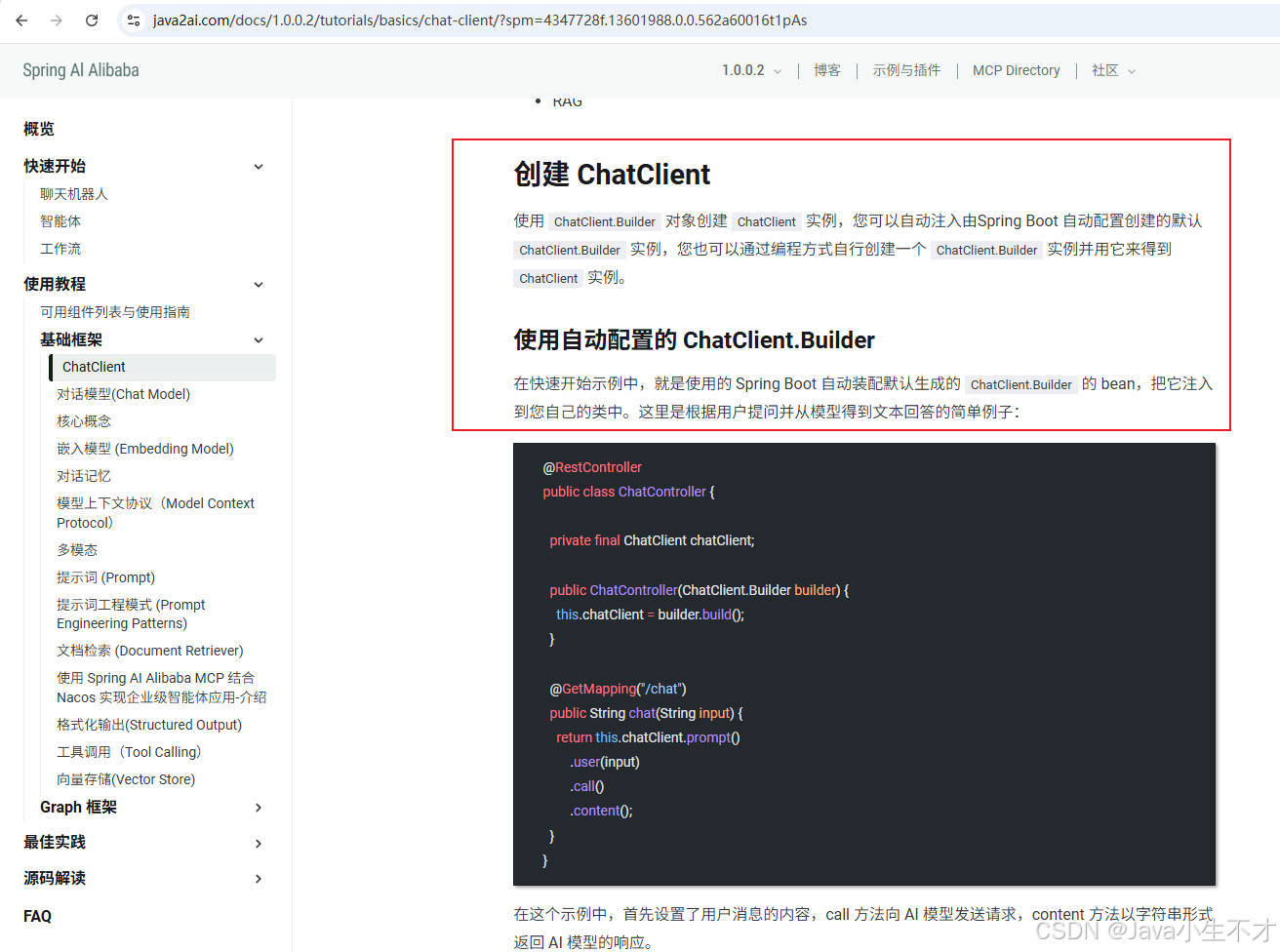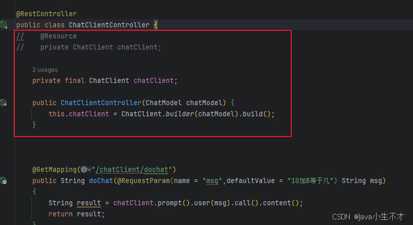 ChatClient 类似于应用程序开发中的服务层,它为应用程序直接提供 AI 服务,开发者可以使用 ChatClient Fluent API 快速完成一整套 AI 交互流程的组装。添加链接描述