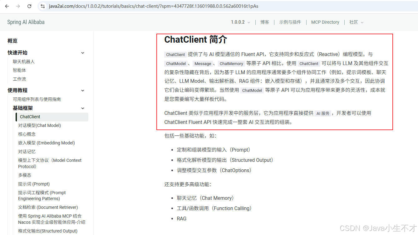- ChatClient是高级封装,基于ChatModel构建,适合快速构建标准化复杂AI服务,支持同步和流式交互,集成多种高级功能。