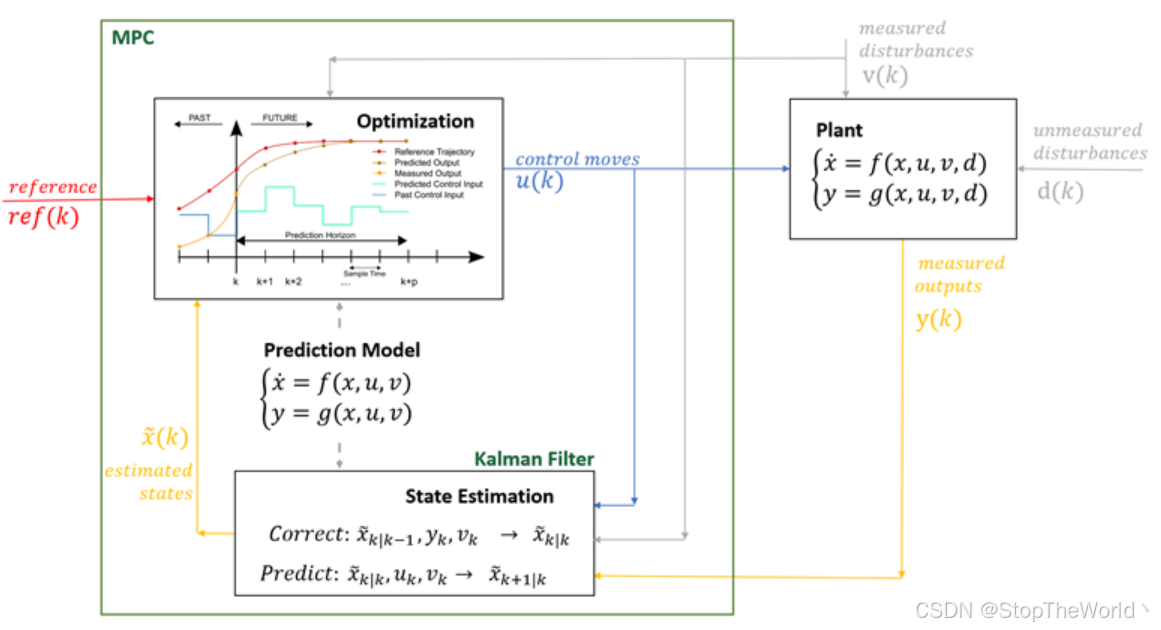 下图展示了基本的MPC控制环路,控制器接收来自模型的测量输出和扰动,并利用内部预测模型估算状态,并计算一系列控制动作,使成本函数在给定视野内最小化。一般来说,这个成本函数通常是关于预测控制动作与参考轨迹之间误差的函数,加上对控制动作变化量的惩罚。这种形式的问题可以很自然地表述为一个QP问题。