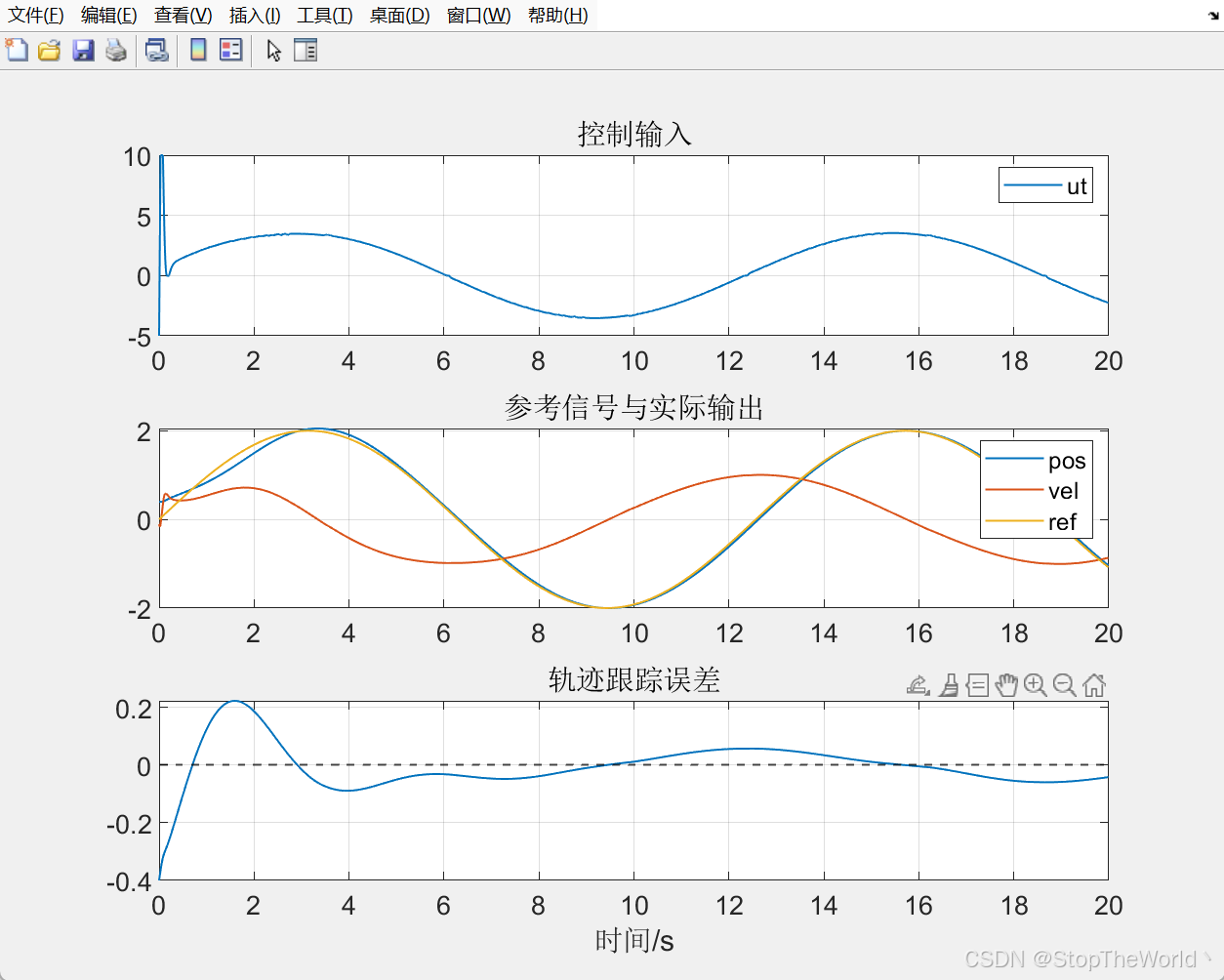 150步,控制时域30步,控制输入限制[-10, 10],控制输入导数限制[-10, 10],输出权重只关心位置跟踪误差即[50, 0],控制输入及其变化导数设为较小的量0.01。 - is done:仿真步长0.01s,仿真时间20s,参考信号正弦