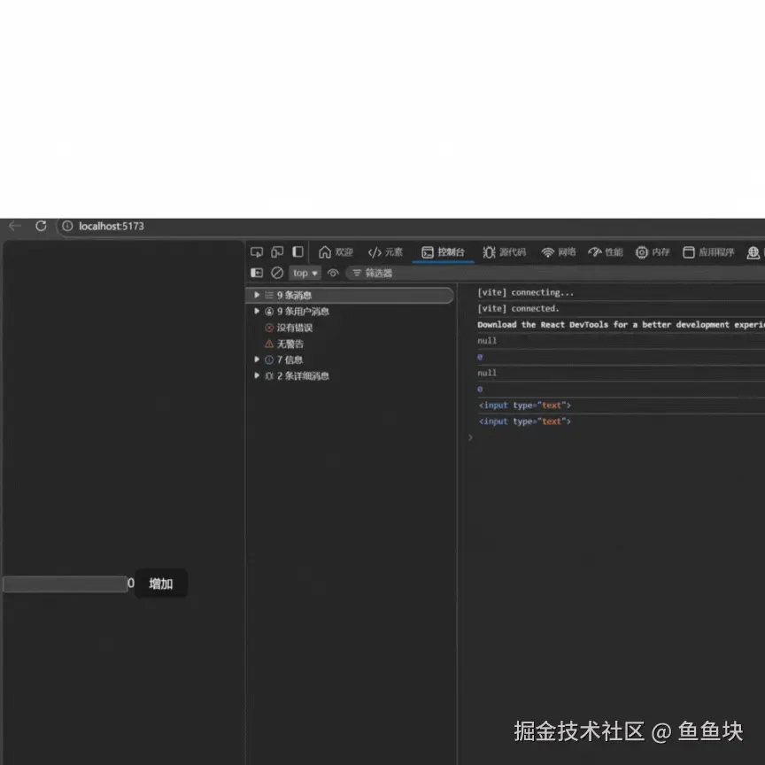 当我们点击增加按钮时,触发重新渲染,程序输出1和< input type="text" >,为什么useRef的.current不是输出null ,那是因为useRef 的 .current 一旦被 React 赋值,就会一直保留该值,直到组件卸载或手动修改。