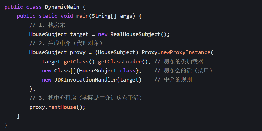 - 人话:告诉 JVM"用房东的类加载器、房东会的活(接口)、中介的规则",生成一个中介;
