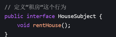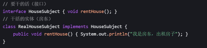 - 人话:找个 "房东"(RealHouseSubject),他会干 "租房"(rentHouse 方法)这个活;