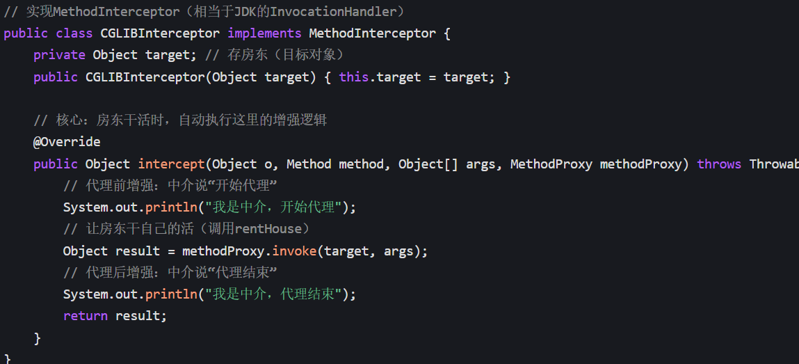 - 人话:中介(CGLIBInterceptor)要在房东租房前说 "开始代理",租房后说 "代理结束";