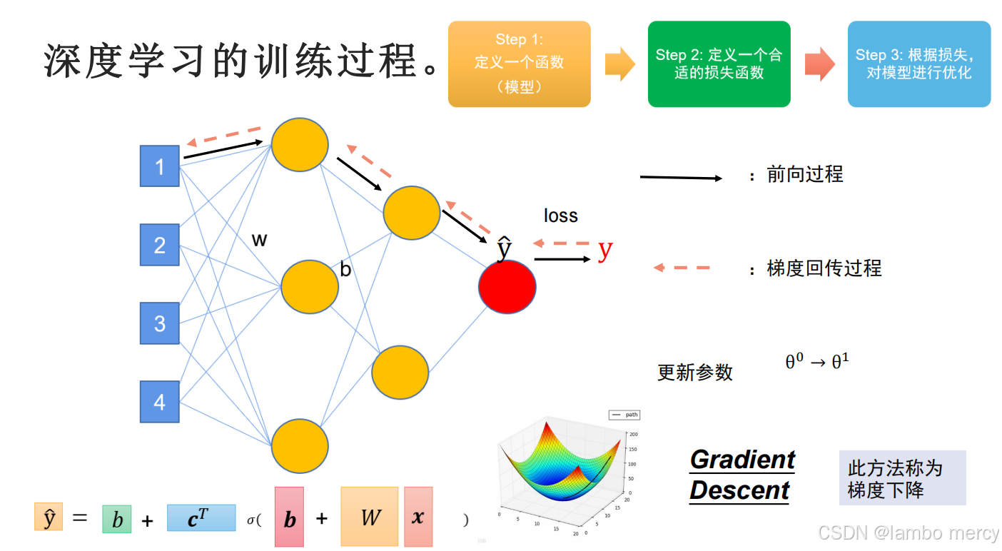 - 输出层:包含 1 个输出节点(y^),通过权重(c1,c2,c3)与隐藏层全连接,最终输出预测结果,b为输出层偏置。