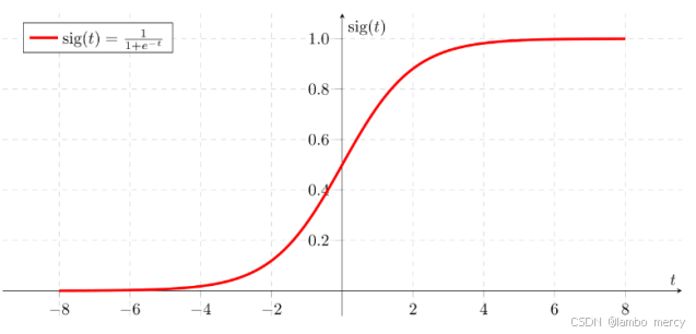 Sigmoid 函数的图像是一条平滑的 S 形曲线,当 x 趋近于负无穷时,函数值趋近于 0;当 x 趋近于正无穷时,函数值趋近于 1。在 x=0 处,函数值是 0.5 。