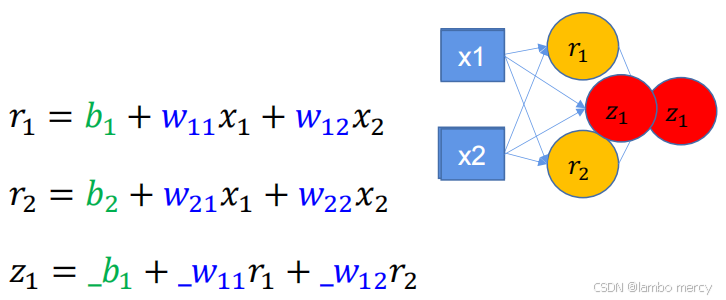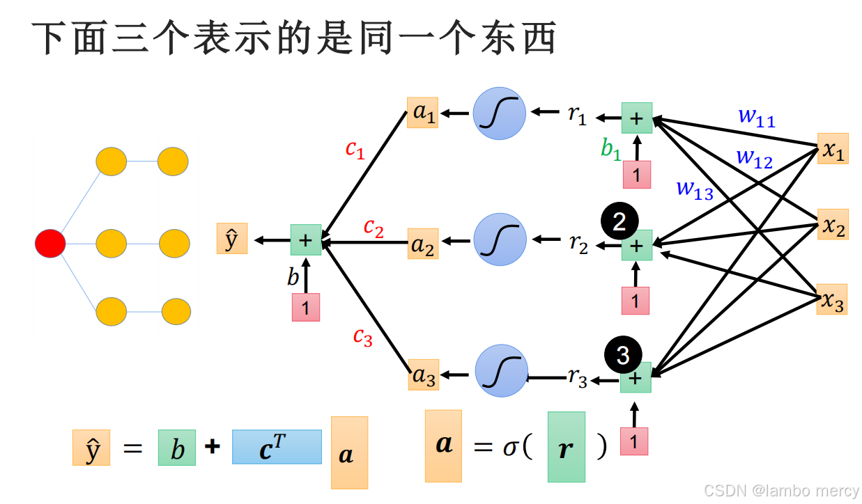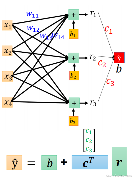 - 隐藏层:包含 3 个节点(r1,r2,r3),每个节点通过权重(w11,w12,...)与输入层全连接,节点内的 "+" 代表加权求和操作,b1,b2,b3为偏置项;