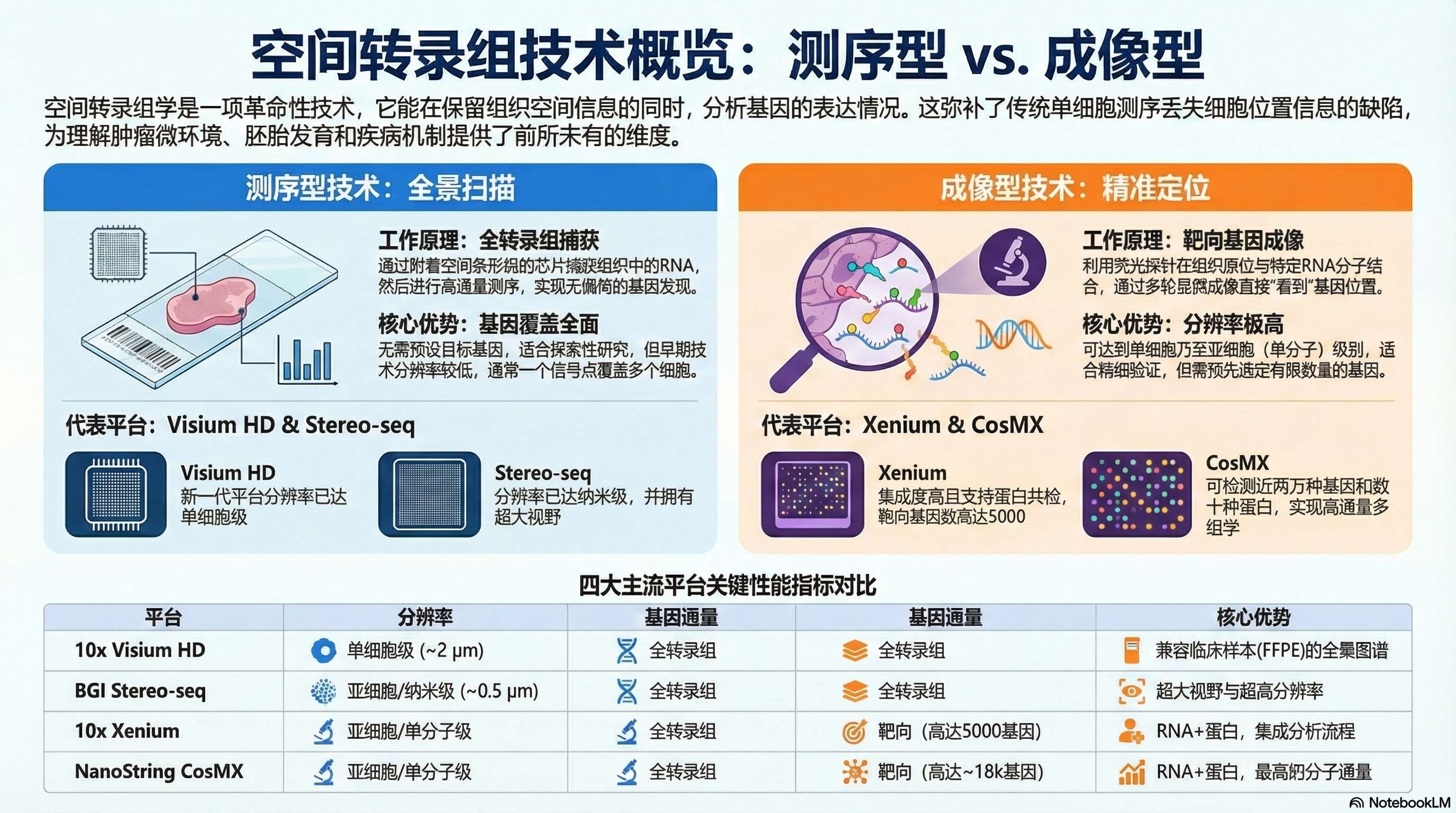 这段时间在处理/对接 空间转录组(ST) 数据,也顺手把相关技术路线做了一次系统梳理。空间转录组看似"一个赛道",实际包含两条完全不同的技术范式:测序型 与 成像型。而不同平台在"分辨率---通量---样本类型---成本---下游分析复杂度"之间的取舍差异,往往决定了你最后能回答什么问题。