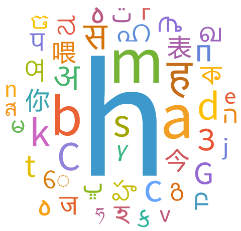 取前 100 种语言,查看每种语言第一个翻译的首字符,并生成词云,显示在这些语言中表示 hello 的首字母分布: