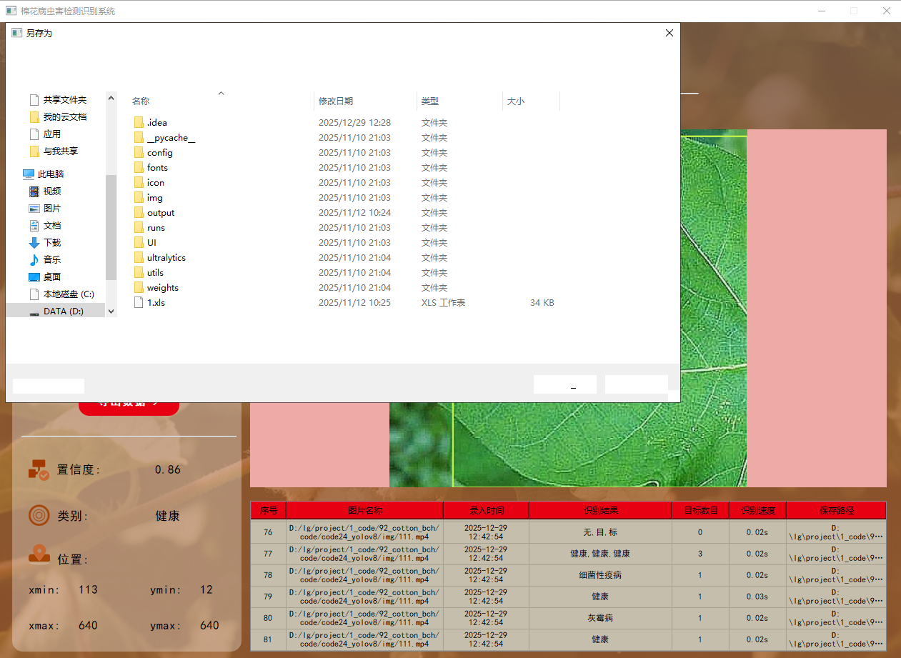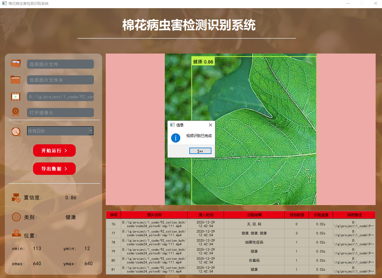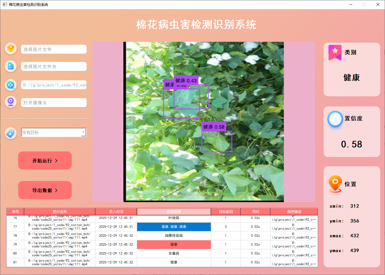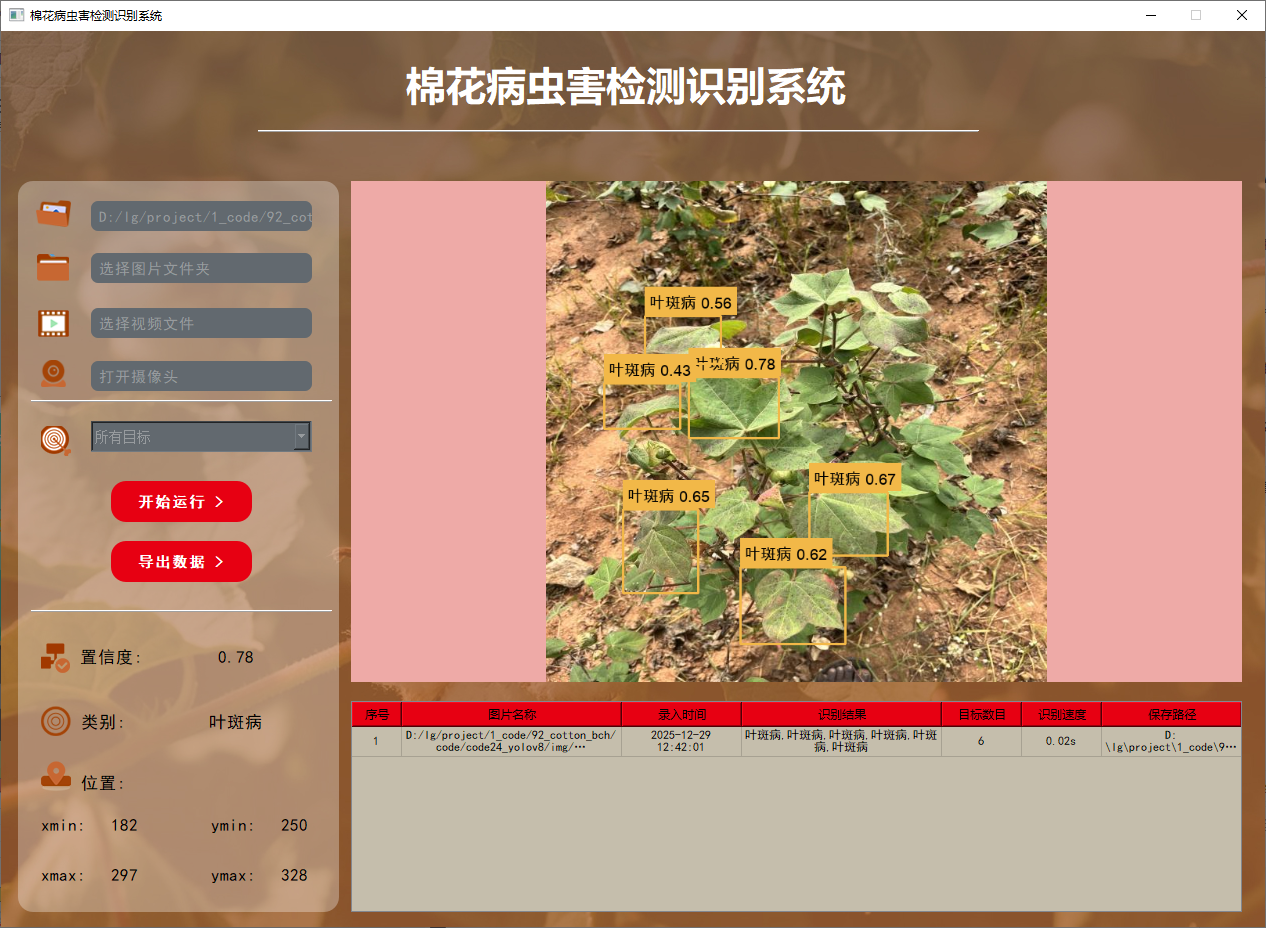 此外,我们开发了一款带有UI界面的棉花病虫害检测识别系统,支持实时检测棉花病虫害的识别,并能够直观地展示检测结果。系统采用Python与PyQt5开发,可以对图片、视频及摄像头输入进行目标检测,同时支持检测结果的保存。本文还提供了完整的Python代码和详细的使用指南,供有兴趣的读者学习参考。获取完整代码资源,请参见文章末尾。
