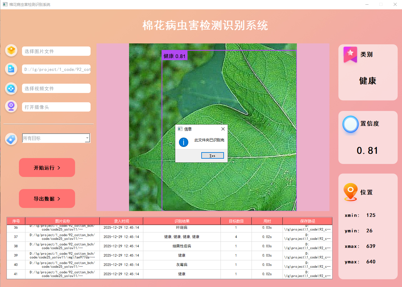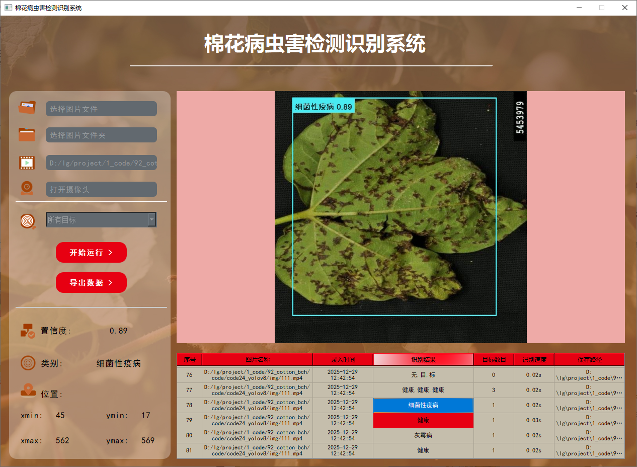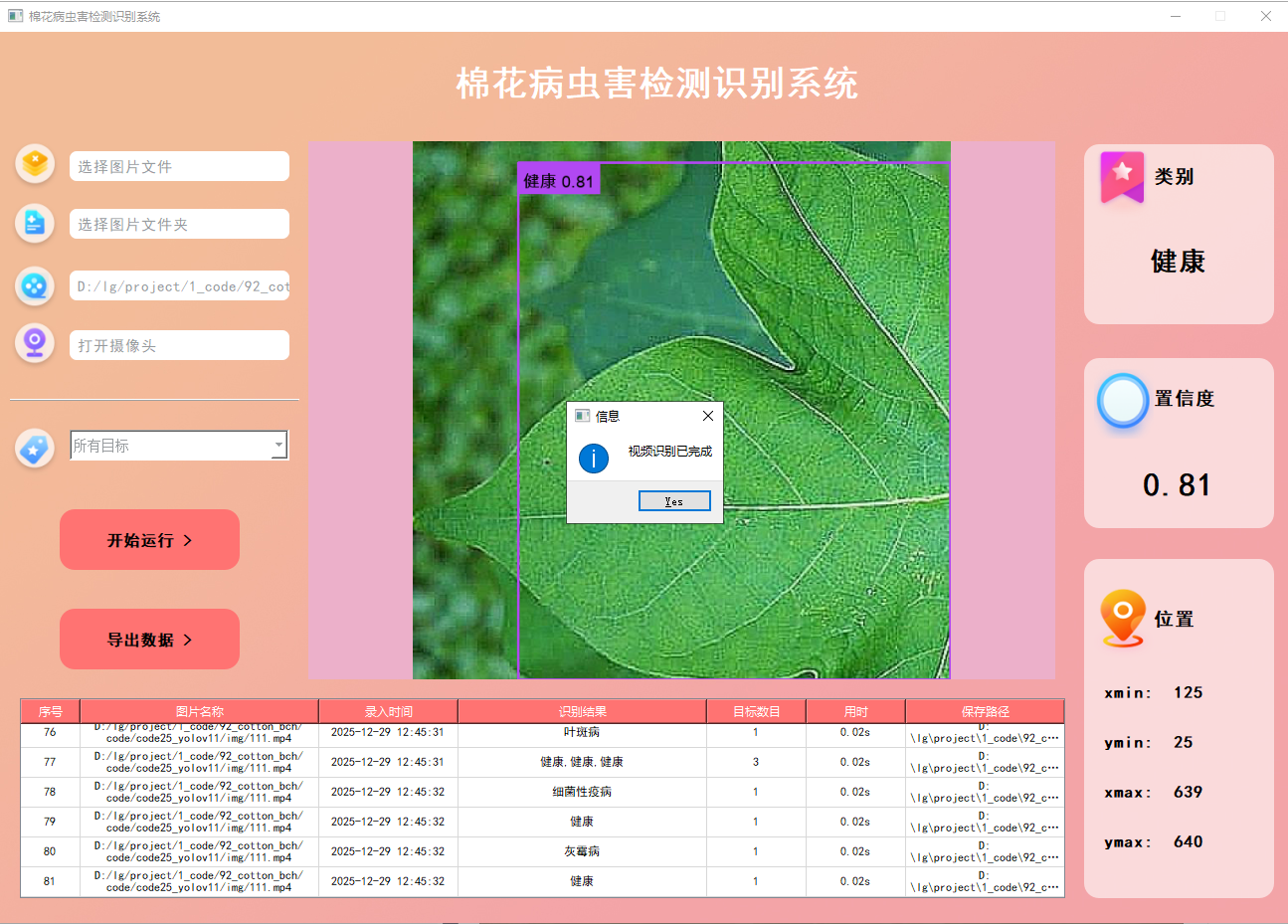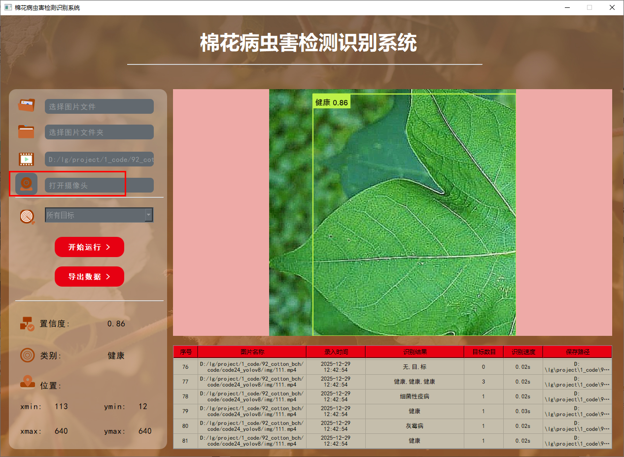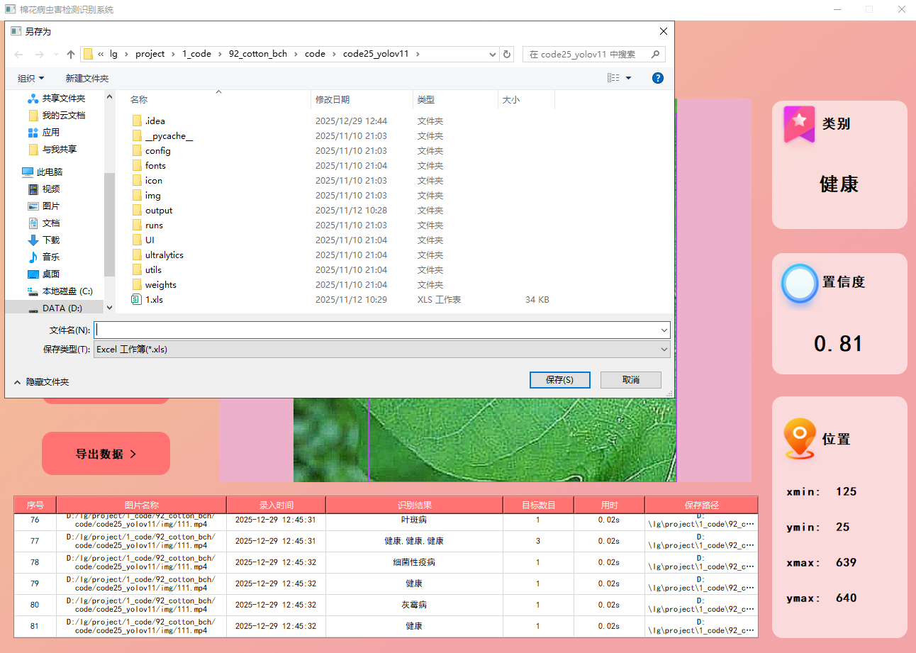 此外,我们开发了一款带有UI界面的棉花病虫害检测识别系统,支持实时检测棉花病虫害的识别,并能够直观地展示检测结果。系统采用Python与PyQt5开发,可以对图片、视频及摄像头输入进行目标检测,同时支持检测结果的保存。本文还提供了完整的Python代码和详细的使用指南,供有兴趣的读者学习参考。获取完整代码资源,请参见文章末尾。