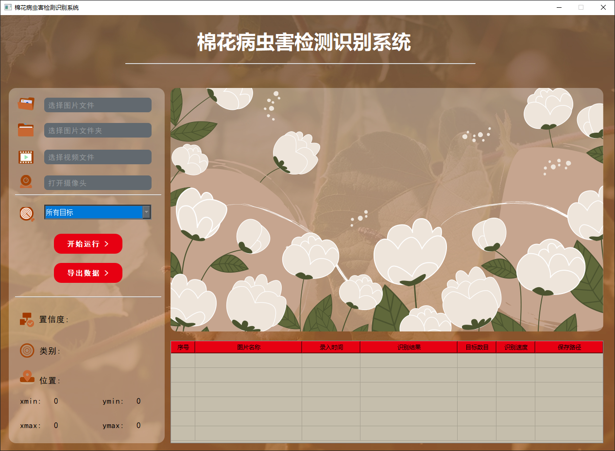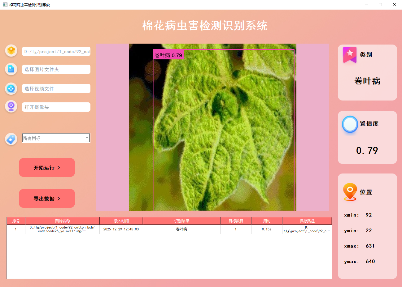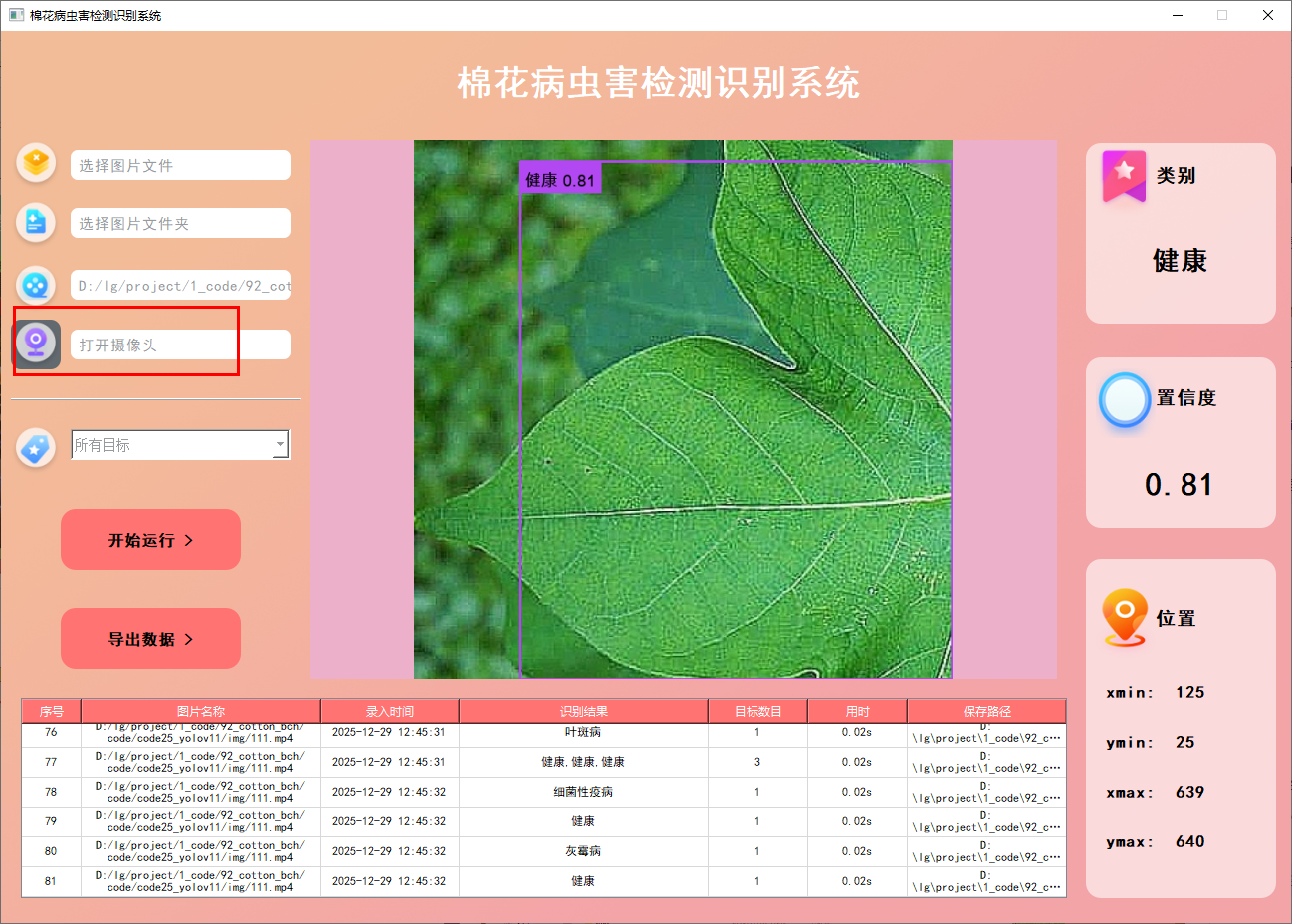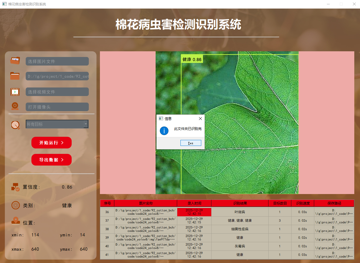 此外,我们开发了一款带有UI界面的棉花病虫害检测识别系统,支持实时检测棉花病虫害的识别,并能够直观地展示检测结果。系统采用Python与PyQt5开发,可以对图片、视频及摄像头输入进行目标检测,同时支持检测结果的保存。本文还提供了完整的Python代码和详细的使用指南,供有兴趣的读者学习参考。获取完整代码资源,请参见文章末尾。