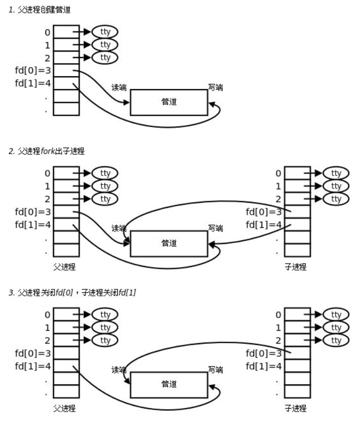 第三步,关闭子进程管道的读端,关闭父进程管道的写端。