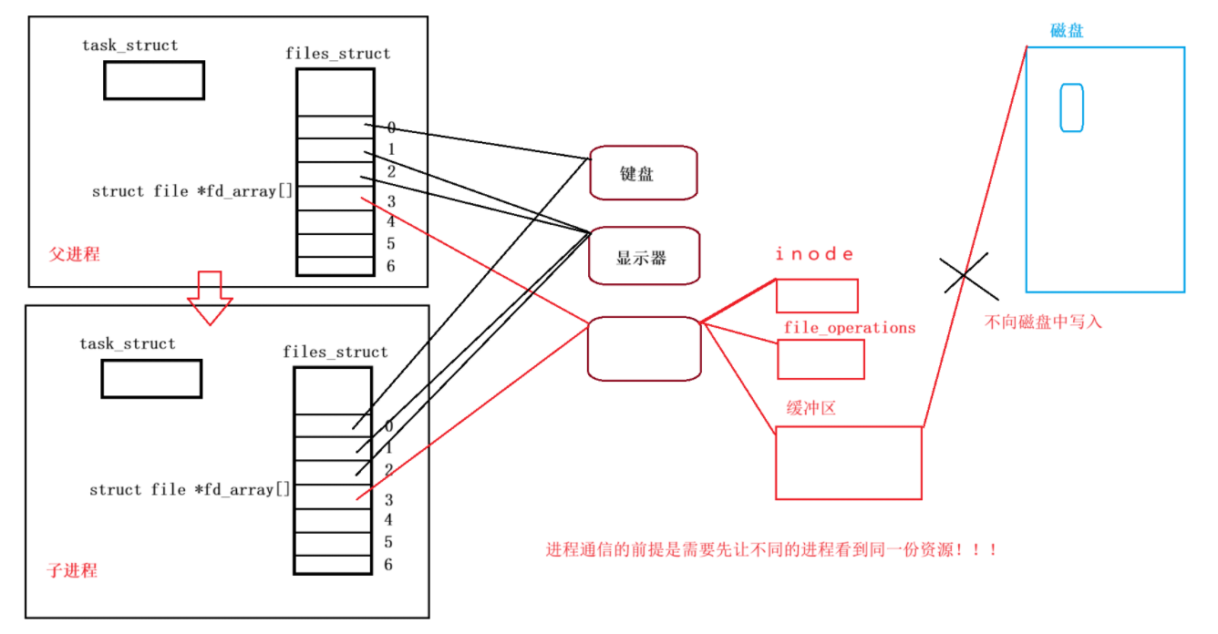 进程通信的本质前提是先让不同的进程看到同一份资源,即管道就是文件。在strcut file结构体中存在引用计数,父子进程存在相同的指针指向同一个文件时,引用计数会增加。